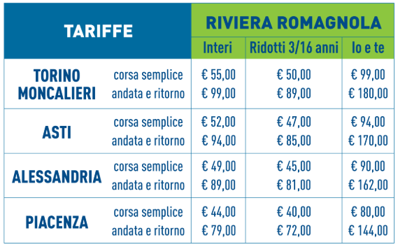 Parti da Torino, Asti, Alessandria e Piacenza e raggiungi la Riviera Romagnola rapidamente e in sicurezza.